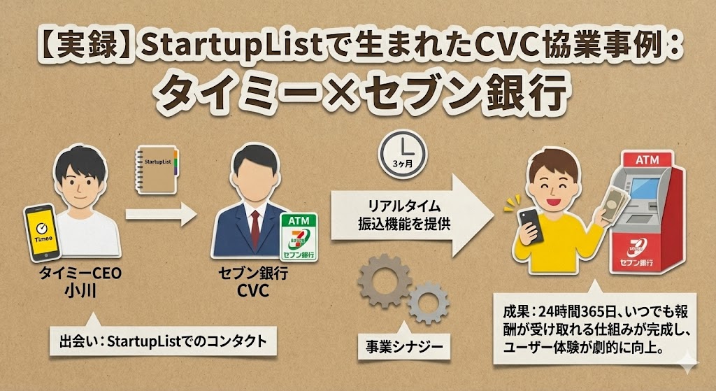 ここで、実際にStartupListを通じてCVCとの出会い、事業を加速させた「株式会社タイミー」と「セブン銀行」の事例を紹介します。
