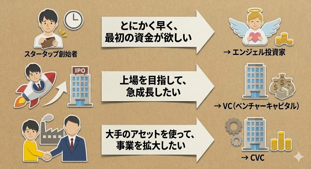 「資金調達をしたいけれど、VCとCVC、エンジェル投資家、結局誰に声をかければいいの?」