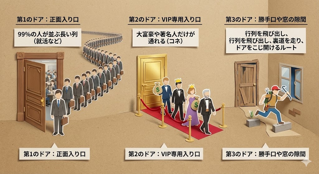 「学生起業」とは、まさにこの「サードドア」を叩く権利を持っている状態です。 大人は「若者の挑戦」に対してはガードを下げます。この「学生カード」を使って決裁者に直接会い、業界の課題をヒアリングし、あわよくば最初の顧客になってもらう。この特権を使わない手はありません。