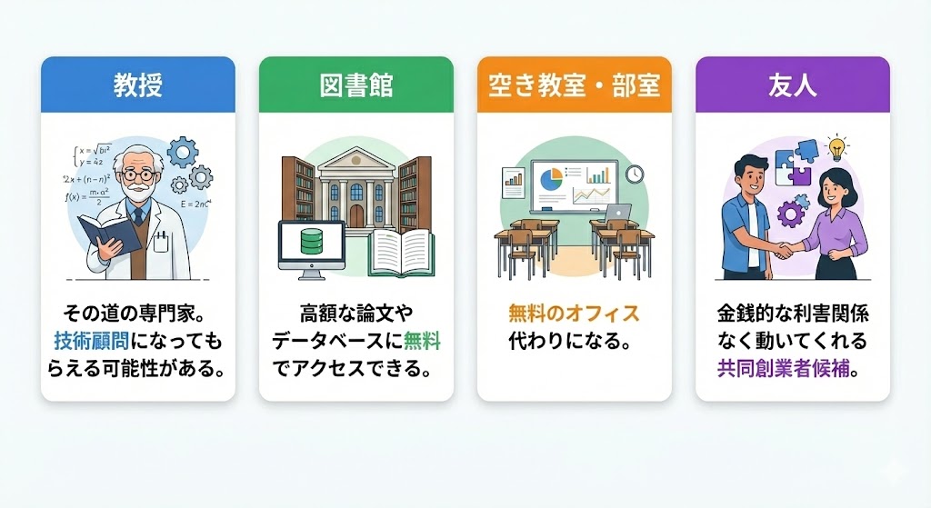 - これらを全て自費で調達しようとすれば、月数十万円の固定費がかかります。固定費ゼロで事業検証ができるのは、学生だけの特権です。