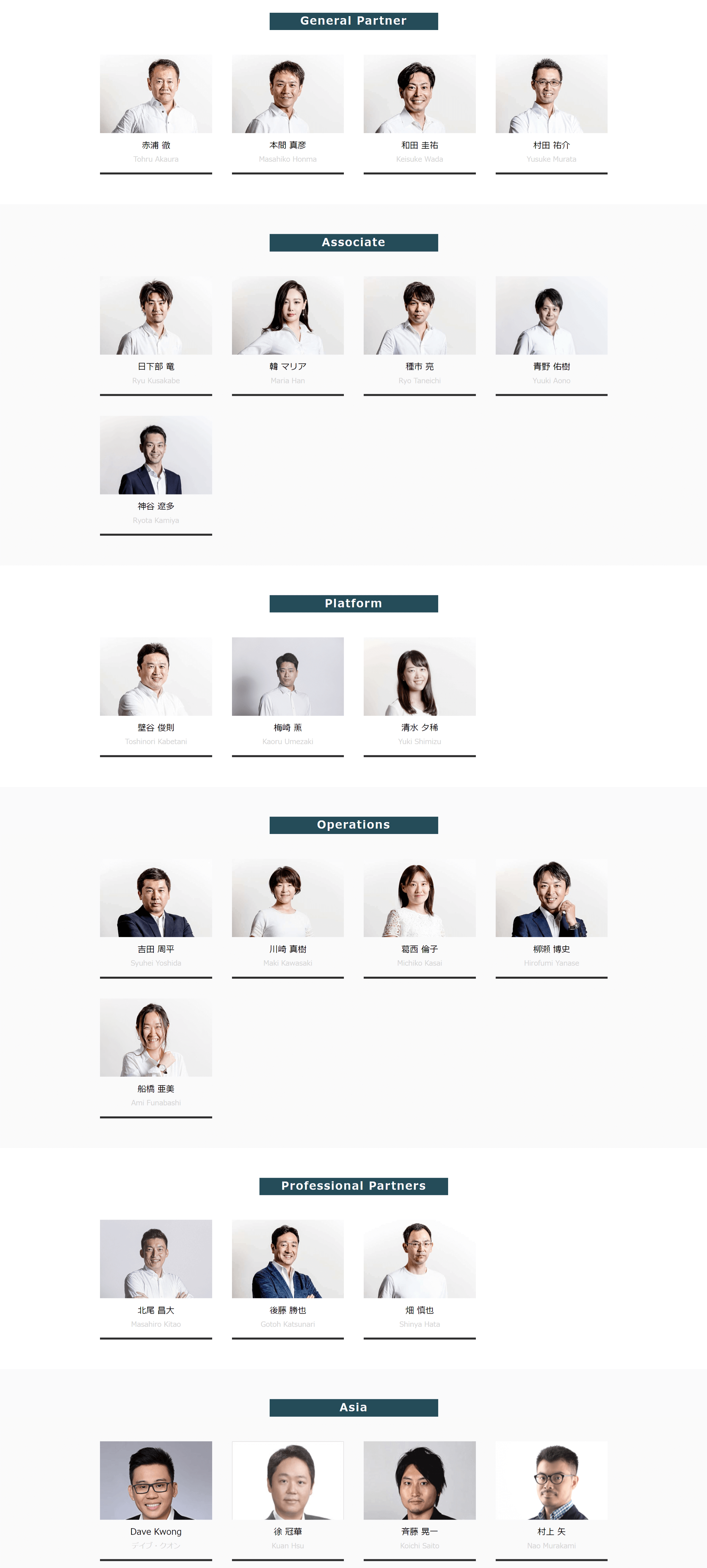 また、”more than a VC”の標榜の元、マーケティング・法務・開発など各分野の外部プロフェッショナルと密に連携し、伝統的なベンチャーキャピタルの枠を超えたスタートアップの支援インフラを構築しています。